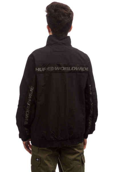 • reflektierende HUF Worldwide-Schriftzüge mit Mesh-Overlays über Brust und Ärmel